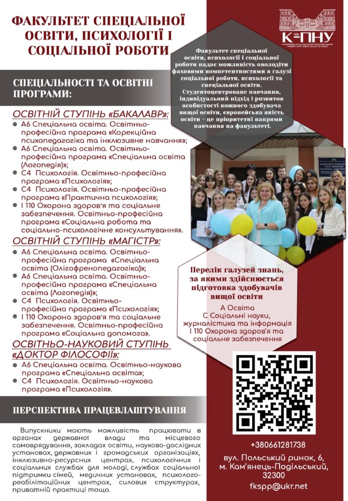 Факультет спеціальної освіти, психології і соціальної роботи К-ПНУ запрошує всіх охочих відвідати День відкритих дверей. Вибір професії – це велика відповідальність перед батьками, перед суспільством, перед собою. Навчання факультеті поєднує в собі і творчість, і раціональність, і знання, і постійний розвиток. Ви матимете змогу ознайомитись зі спеціальностями, отримати відповіді на всі питання щодо вступу, навчання, дозвілля, проживання.