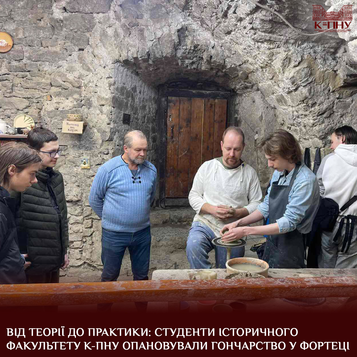 Здобувачі вищої освіти історичного факультету К-ПНУ в межах практичного заняття під керівництвом кандидата історичних наук, доцента Віталія Гуцала відвідали гончарну майстерню на території Кам’янець-Подільської фортеці. Така форма роботи стала не просто екскурсією, а важливим елементом фахової підготовки майбутніх археологів – симбіоз теоретичних знань із безпосереднім практичним досвідом.