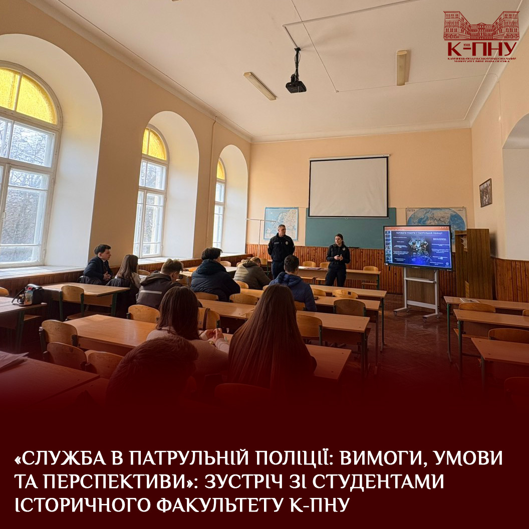 9 квітня 2026 року інспектори з рекрутингу Управління патрульної поліції в Хмельницькій області старший лейтенант поліції Анастасія Омельченко й сержант поліції Володимир Сулима провели профорієнтаційну зустріч зі студентами спеціальності «Історія та правознавство» історичного факультету Кам’янець-Подільського національного університету імені Івана Огієнка.