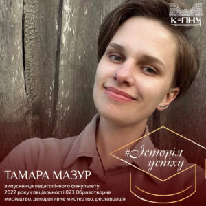 – випускниця педагогічного факультету 2022 року спеціальності 023 Образотворче мистецтво, декоративне мистецтво, реставрація. Працює в НІАЗ “Кам’янець” (посада – старший науковий співробітник) і в Галереї мистецтв (художник). |